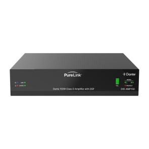 The DIO-AMP150 is a two-channel class D amplifier featuring Dante 2CH digital inputs and outputs, and balanced or unbalanced line level analog inputs and outputs. It can be used for powering low impedance (4Ω/8Ω) speaker systems with a maximum power of 2 x 75 Watts, while bridging to a constant voltage (100V and 70V) is possible with a maximum output power of 150 Watts.